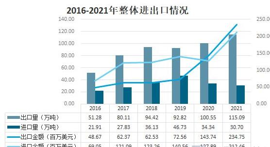 從全體上看,近兩年我國石英(天然砂在外)和石英巖(不管是否粗加修整或僅用鋸或其他辦法切割成矩形板或塊)出口量堅持增加趨勢,進(jìn)口量出現(xiàn)下滑,進(jìn)出口量存在較大差距,但進(jìn)口金額一度領(lǐng)先。2021年,我國共出口石英及石英巖115.09萬噸,出口金額為234.75百萬美元,共進(jìn)口石英及石英巖30.7萬噸,進(jìn)口金額為212.46百萬美元。