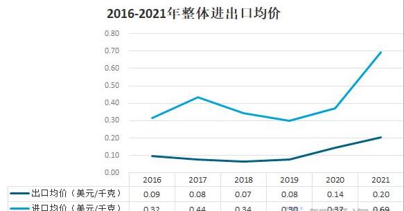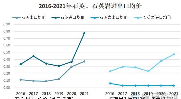 我國石英及石英巖全體進(jìn)口均價繼續(xù)領(lǐng)先,2021年進(jìn)口均價為0.69美元/千克,出口均價僅為0.2美元/千克。